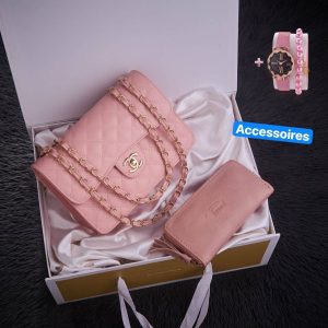 انغمس في الرفاهية مع مجموعتنا الكاملة، التي تجمع بين حقيبة يد متطورة ومحفظة مطابقة وساعة أنيقة وسوار أنيق. تجسد كل قطعة في هذه المجموعة جوهر الأناقة الخالدة، مما يسمح لك بالتميز بأناقة في أي مناسبة.