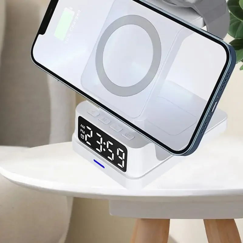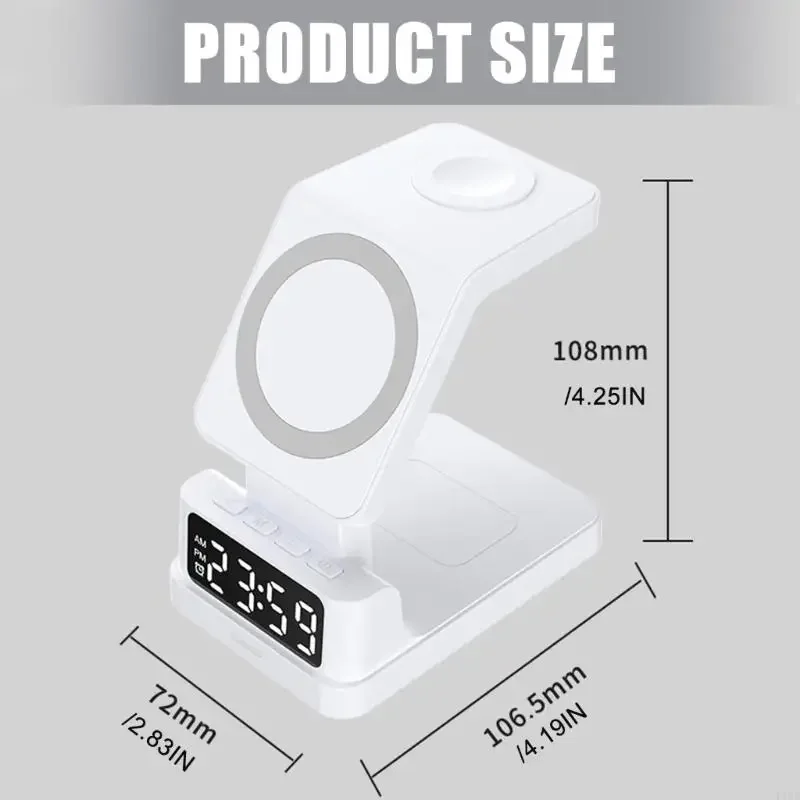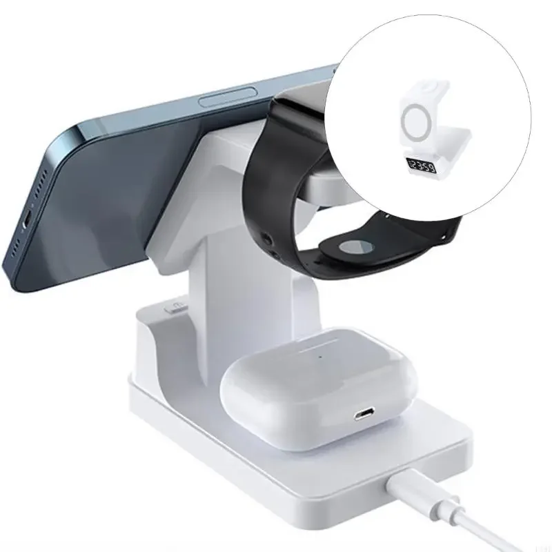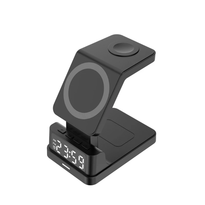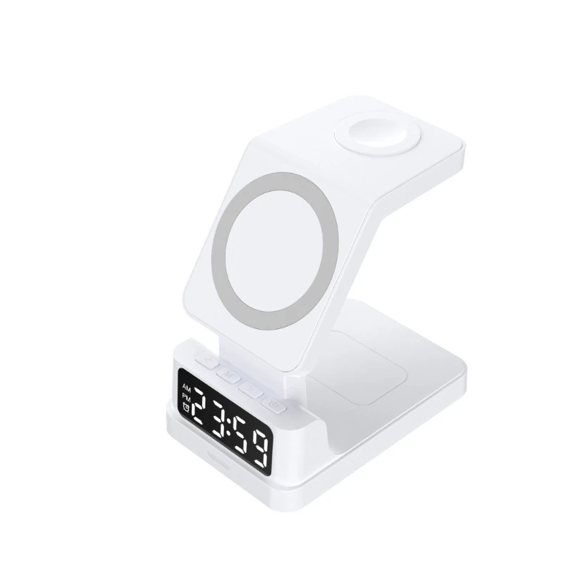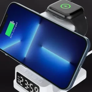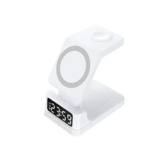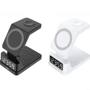 Ce support multifonction intègre également une horloge digitale élégante, idéale pour un bureau ou une table de chevet. Son design compact permet de garder votre espace organisé tout en regroupant plusieurs fonctions essentielles en un seul appareil : recharge, support de téléphone et affichage de l’heure.