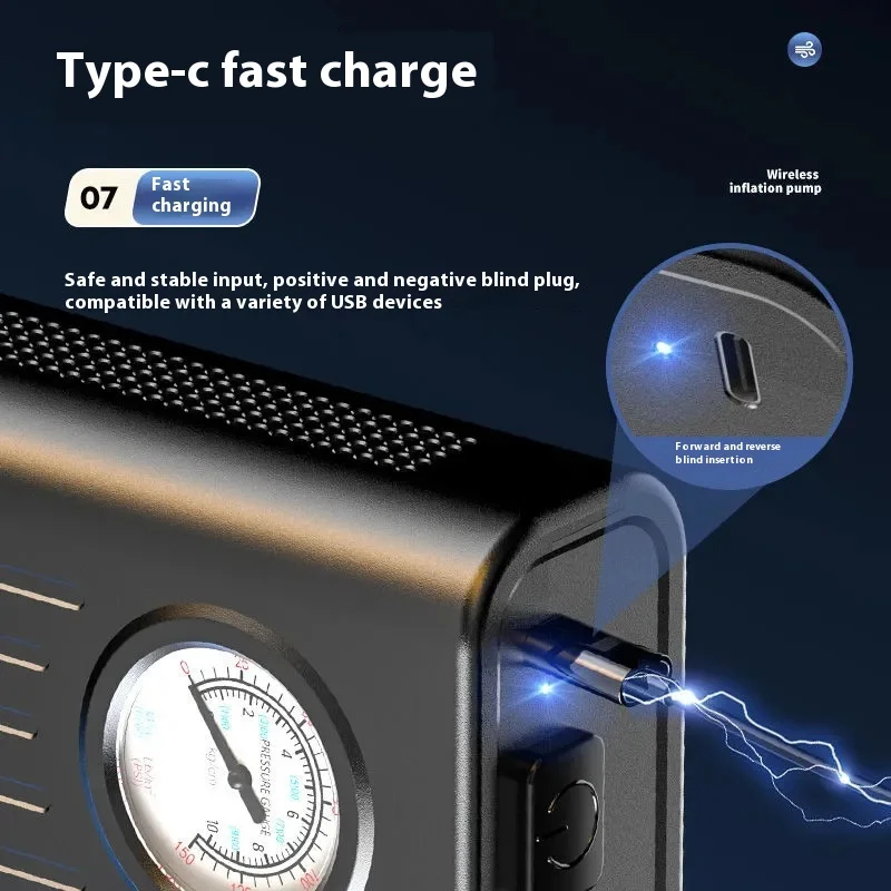 La pompe à air sans fil pour voiture est un gonfleur portable haute puissance conçu pour faciliter le maintien de la pression des pneus sans effort. Grâce à sa batterie rechargeable USB, elle fonctionne de manière entièrement automatique, vous permettant de gonfler rapidement les pneus de petites voitures, vélos, motos ou ballons en quelques minutes seulement. Léger et compact, cet appareil se transporte facilement dans le coffre ou le sac à main.
