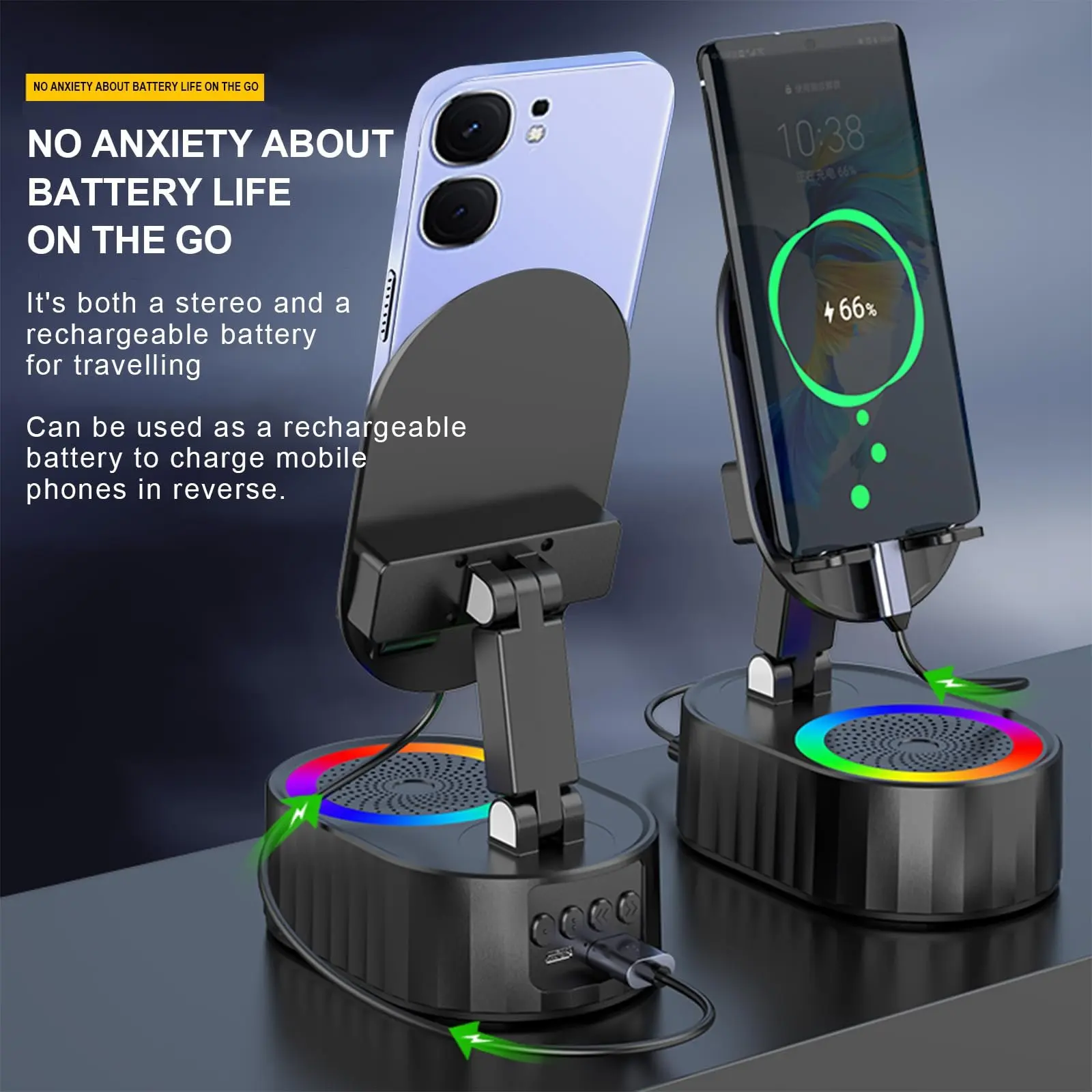 Équipé d’un haut-parleur à induction, ce support amplifie le son de votre téléphone sans connexion Bluetooth ni câbles, offrant une expérience audio améliorée de manière simple et efficace. Il intègre également une batterie externe (power bank), vous permettant de recharger votre smartphone à tout moment, idéal pour une utilisation prolongée.